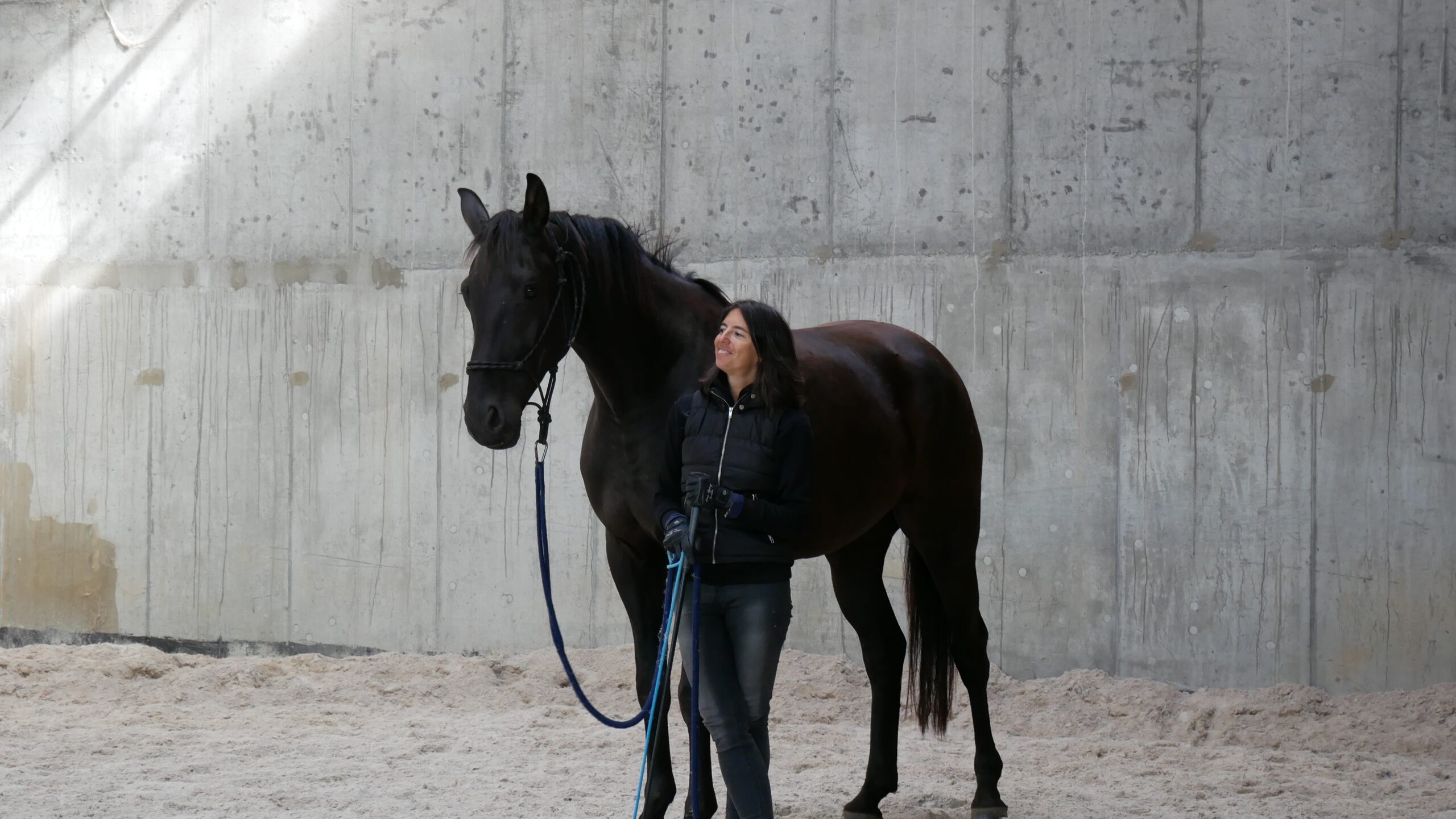 POZIOM 2: Złap mnie, czyli łapanie z podążaniem za człowiekiem. Tutaj praca na kołach, przejścia i zmiany kierunku odbywają się na małym placu, najlepiej lonżowniku. Koń sam decyduje na jakiś zakresie lonżowniku pracuje. Może korzystać z całości terenu i opierać się o ściany. Jeżeli sam oferuje bliższy dystans, jest za to premiowany. Jeżeli chcemy wykonywać prowadzenie z bliska, obowiązuje nas tylko najbliższy dystans. Stopniowe zrównywanie się chęci do bycia blisko z chęcią do odejścia.