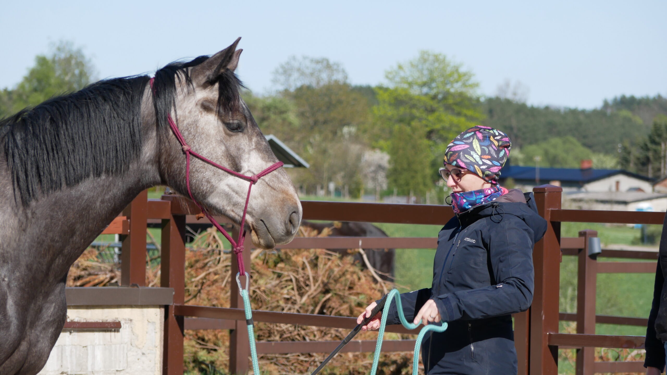 Na drugim poziomie pracy z ziemi coraz mocniej przygotowujemy konia do tego, co wydarza się w siodle. To właśnie tutaj zaczynamy używać tylko jednej ręki, dokładnie w miejscu, gdzie w jeździe działa łydka jeźdźca – czyli w okolicy popręgu.